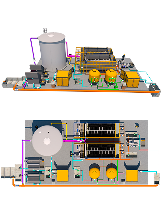 La camara de floculacion ha sido diseñada para manejar un tiempo de retención por encima de 15 minutos, garantizando la formacion de floculos con suficiente densidad y peso para una decantación primaria. La implementación de una interface lamelar con 60° de inclinación ofrece una barrera que impide el avance de flóculos o sólidos a la etapa de perfeccionamiento y filtración.