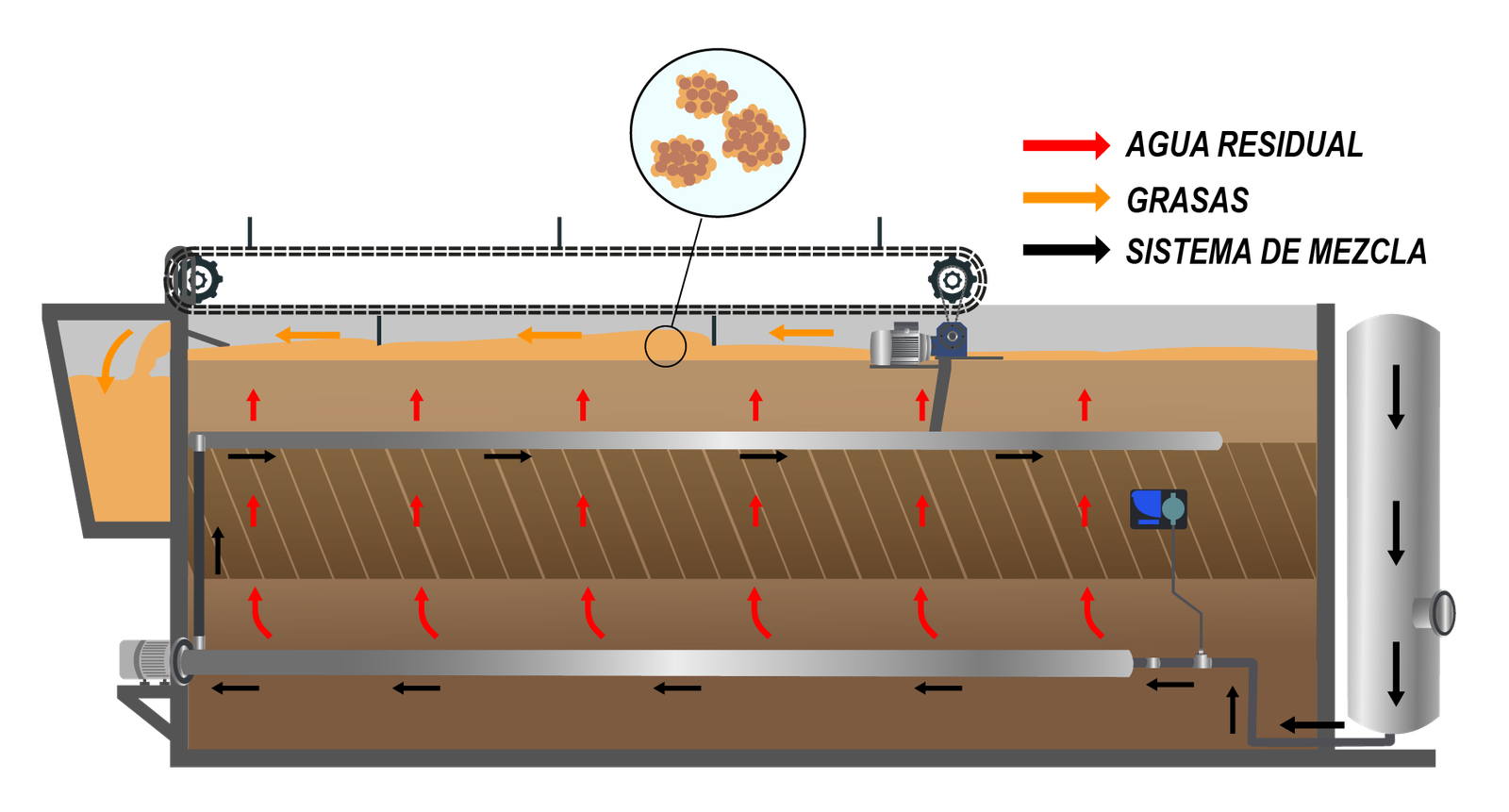 Un sistema DAF por flotación por aire disuelto, es un proceso utilizado en el tratamiento de aguas residuales para separar sólidos suspendidos, aceites, grasas y otras partículas de las aguas mediante la inyección de microburbujas de aire. Estas burbujas se adhieren a las partículas, disminuyendo su densidad y permitiendo que floten hacia la superficie, donde se eliminan como una capa de lodo o espuma.