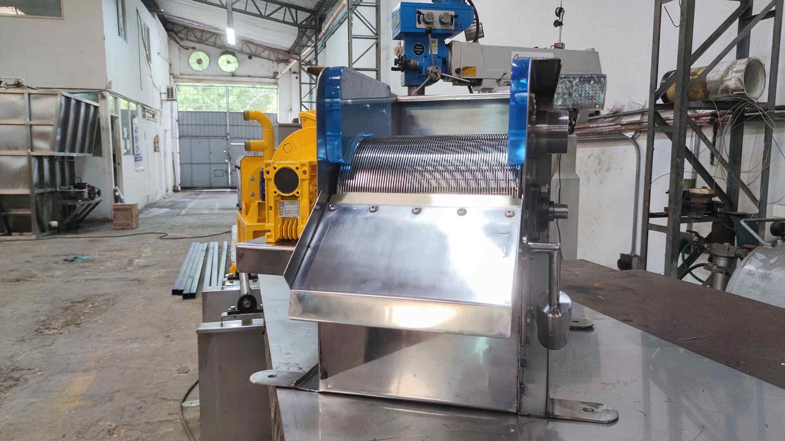 Funcionando. O líquido a ser filtrado entra na caixa de alimentação, localizada na parte posterior da peneira, através de um tubo de diâmetro adequado à vazão calculada; A caixa foi projetada para acalmar o fluxo e distribuí-lo por todo o comprimento do cilindro filtrante.