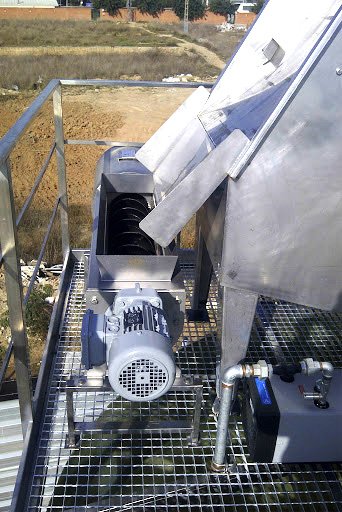 Nuestro Tornillo de Escurrido recibe de forma continua los sólidos a través de la tolva de entrada. Posteriormente un pistón de sección circular, accionado por un grupo hidráulico, actúa compirmiendo y deshidratando los reisduos hasta el grado deseado.