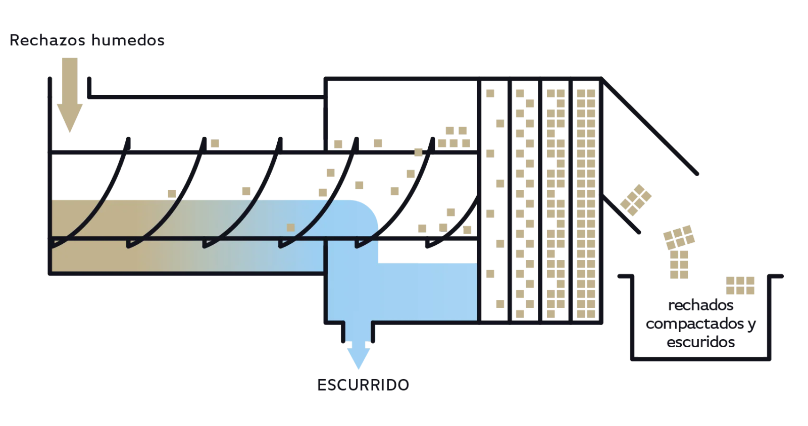 La deshidratación de los residuos hasta el grado deseado se consigue por la retención de los rechazos y el filtrado de la humedad contenida en ellos que se hace a través de la malla que a modo de tamiz rodea el final del sin-fin.