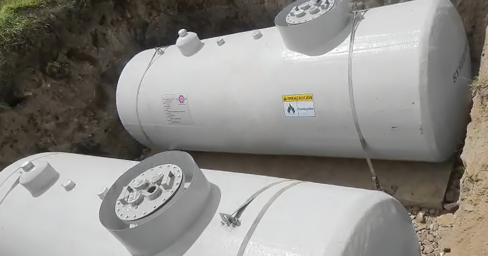 Nuestros Tanques para almacenamiento de combustibles en fibra de vidrio incluyen como accesorios estandar de bases de hombre muerto o correas de sujeción. La instalación de correas de sujeción para un tanque de almacenamiento de combustible en PRFV subterráneo requiere asegurar el area, cavar un hoyo con paredes en ángulo, bajar y nivelar las bases de concreto, bajar el depósito, asegurar las correas, unirlas y apretarlas en las bases. Todo ello dentro de un espacio acotado, con los peligros que ello conlleva. SYNERTECH reduce el tiempo de instalación y los peligros inherentes.